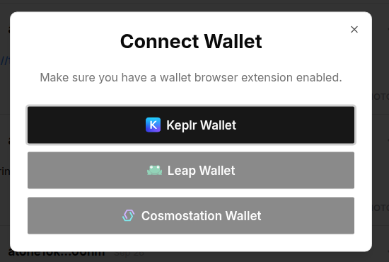 Select a wallet such as Keplr, Leap, or Cosmostation