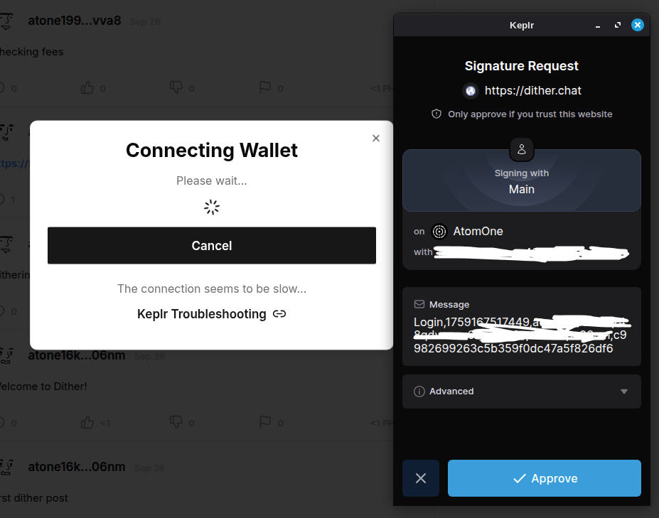 Dither uses your account address associated with the AtomOne chain to post.